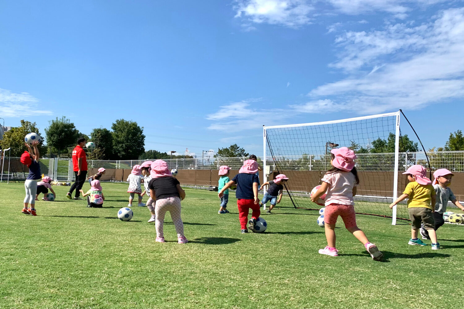 全面天然芝のグラウンドで、ケガを気にせずのびのびとサッカーを楽しめます。風が強くても砂埃もたちません。